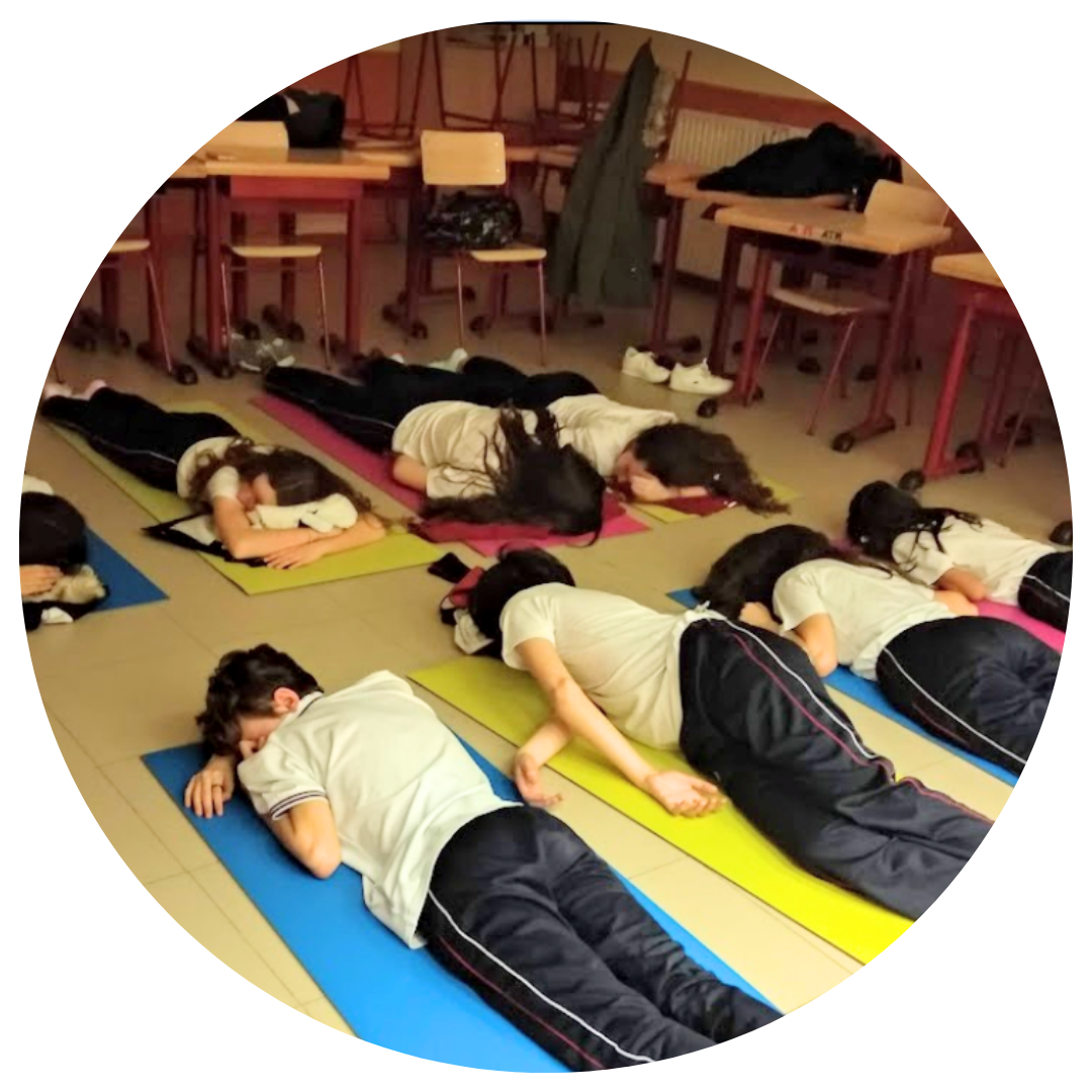 • Sesiones periódicas: recomendadas para las etapas de infantil, primaria y primeros cursos de secundaria, con un mímimo de 3 sesiones por grupo repartidas en semanas consecutivas; cuyo objetivo es el de promover el autoconocimiento, la gestión de las emociones y la consecución de la consciencia corporal a través de técnicas de atención plena o Mindfulness, herramientas de relajación a través de la vibración y de dinamicas grupales, entre otras.